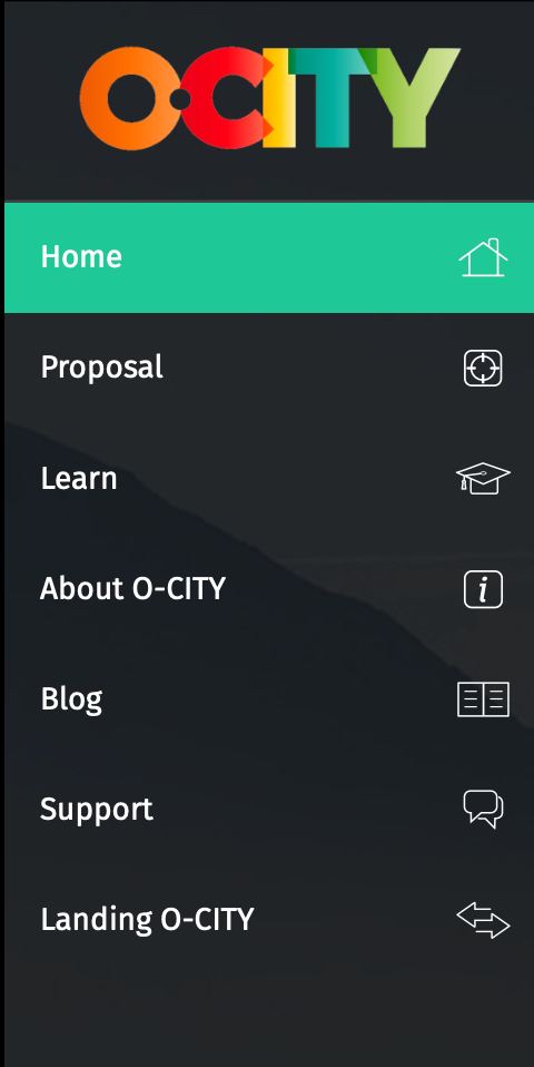 "Blog", "About O-CITY" y "Landing O-CITY" redirigen fuera de la app, a la misma web principal de Ocity. Tres ítems distintos, mismo destino externo. El usuario ya está dentro de la plataforma, no tiene sentido sacarlo. El menú mezcla navegación interna con enlaces que abandonan la app sin distinción visual.